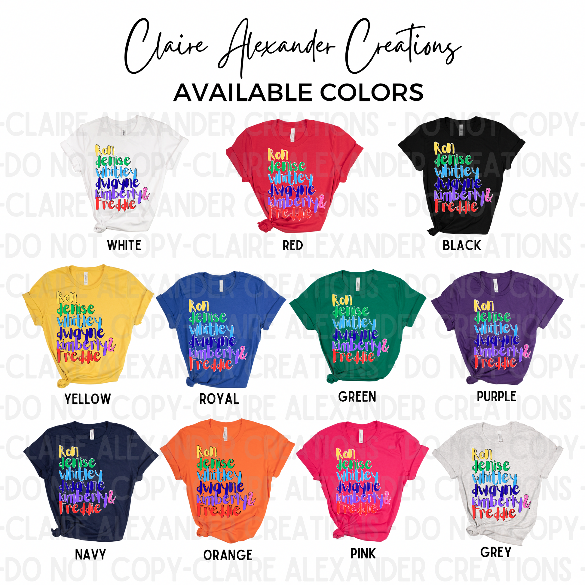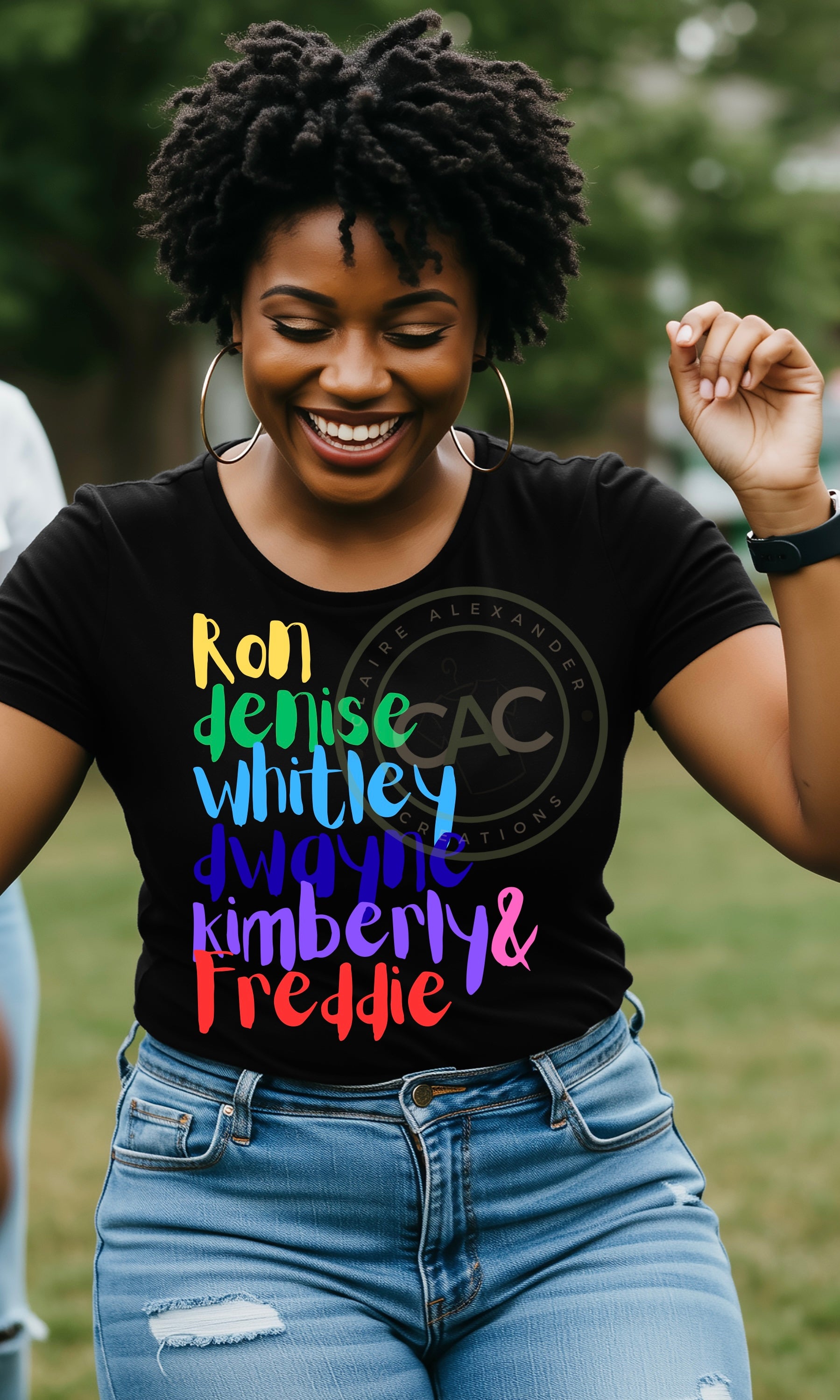 This design is a bold, colorful tribute to the classic sitcom A Different World — a show that celebrated Black excellence, culture, and college life. Each name is styled in vibrant hues that pop against a soft black tee, making it a standout piece for any fan or 90s lover.
