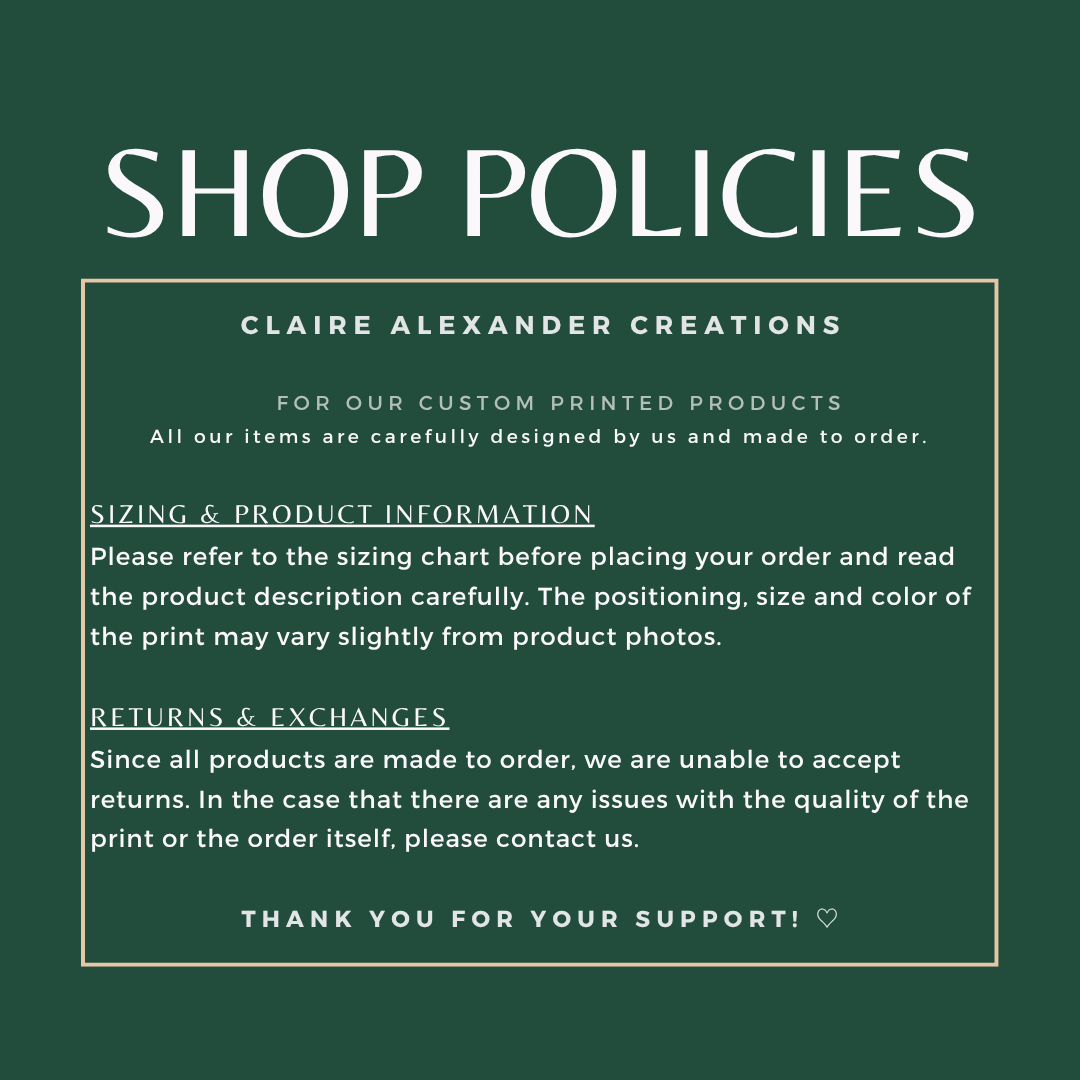 At Claire Alexander Creations, we want you to love your order! Please review our policy below regarding returns and exchanges.