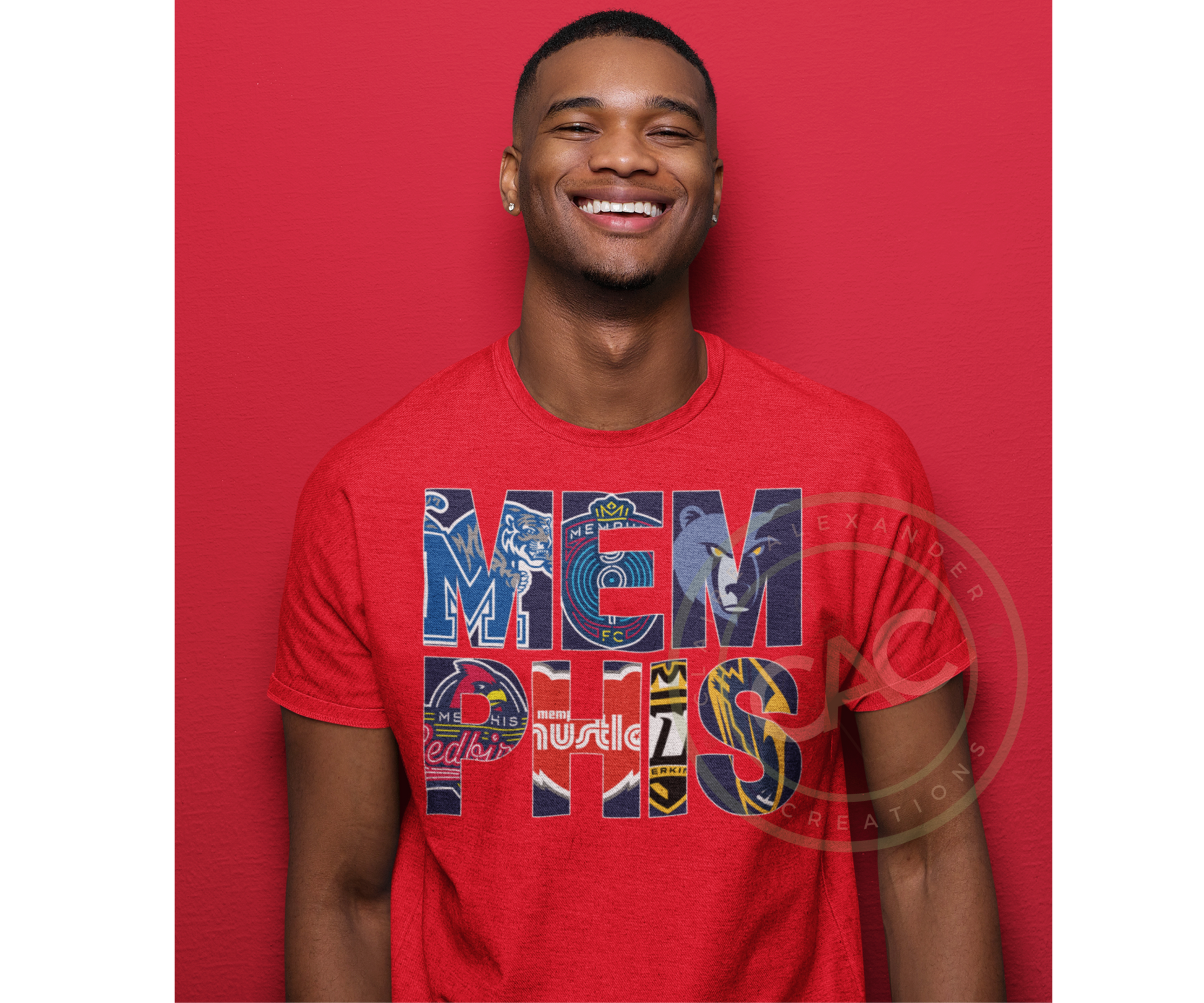 Game day or any day—rep all things Memphis with the Mem Sports Tee. This design spells out Memphis using a mashup of iconic local sports logos, celebrating the city’s love for the game, hustle, and hometown pride.